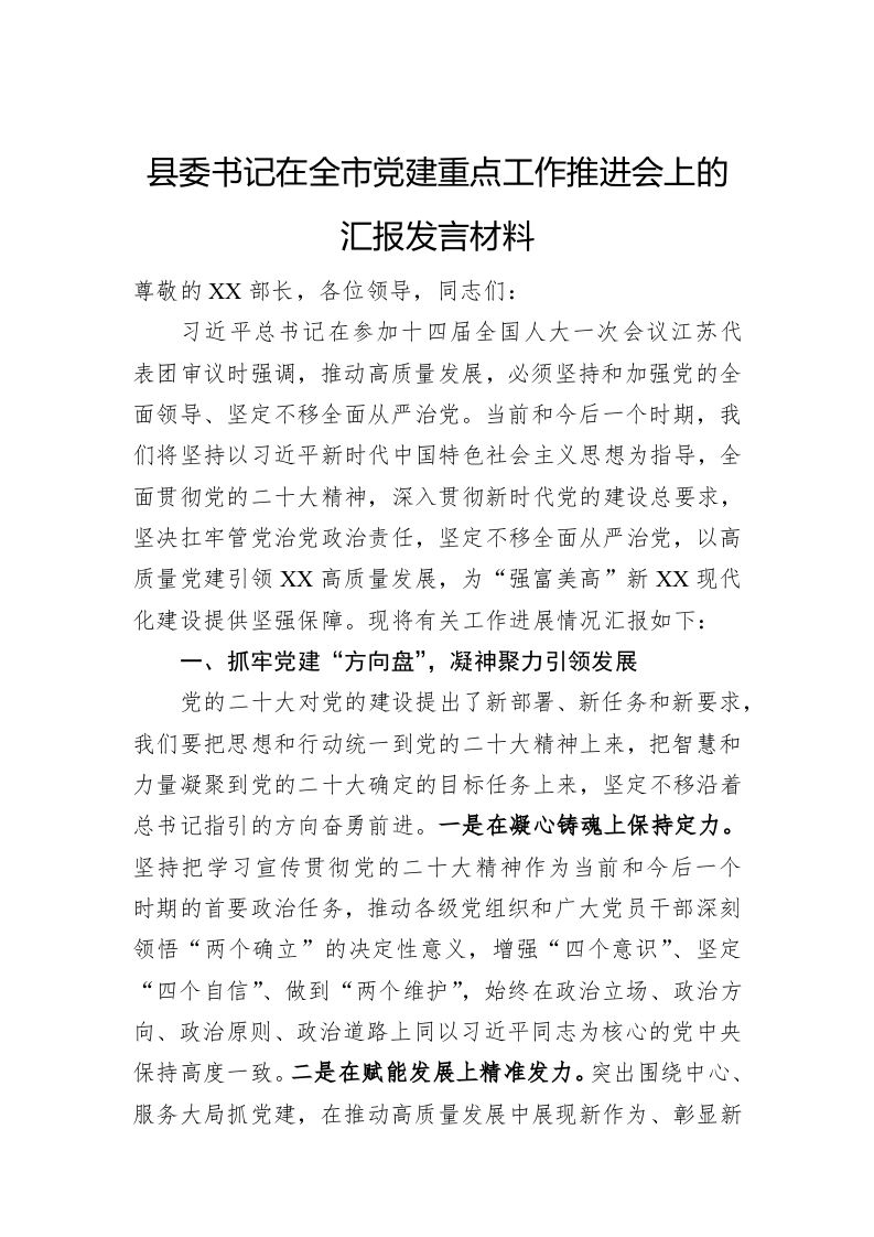 / 县委书记在全市党建重点工作推进会上的汇报发言材料