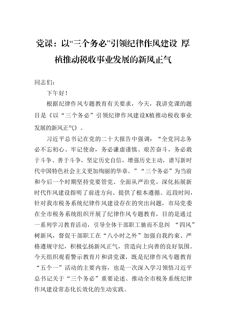 / 党课:以“三个务必”引领纪律作风建设 厚植推动税收事业发展的新风正气