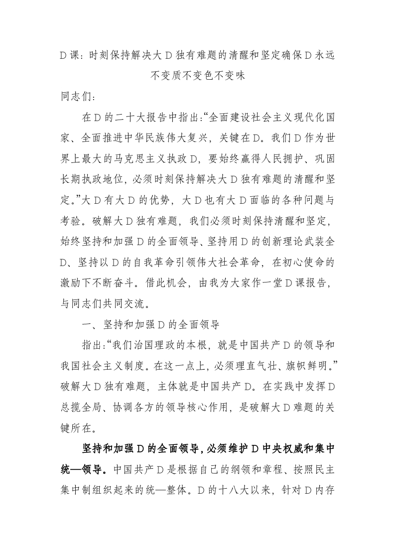 / 党课:时刻保持解决大党独有难题的清醒和坚定+确保党永远不变质不变色不变味