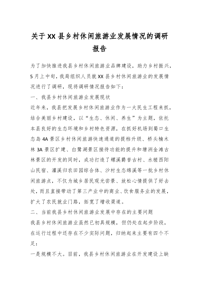 / 关于XX县乡村休闲旅游业发展情况的调研报告