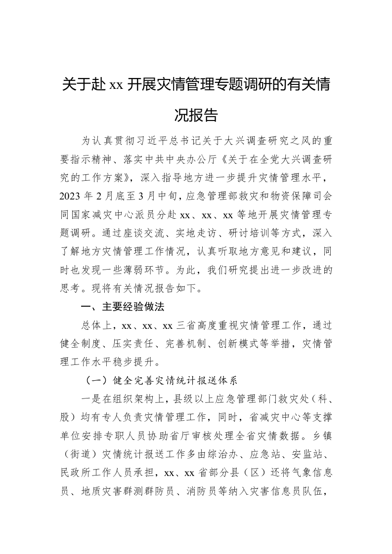 / 关于赴xx开展灾情管理专题调研的有关情况报告