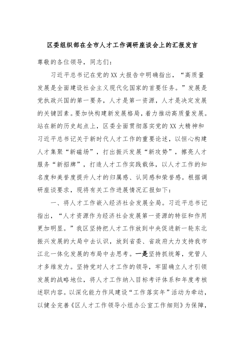 / 区委组织部在全市人才工作调研座谈会上的汇报发言