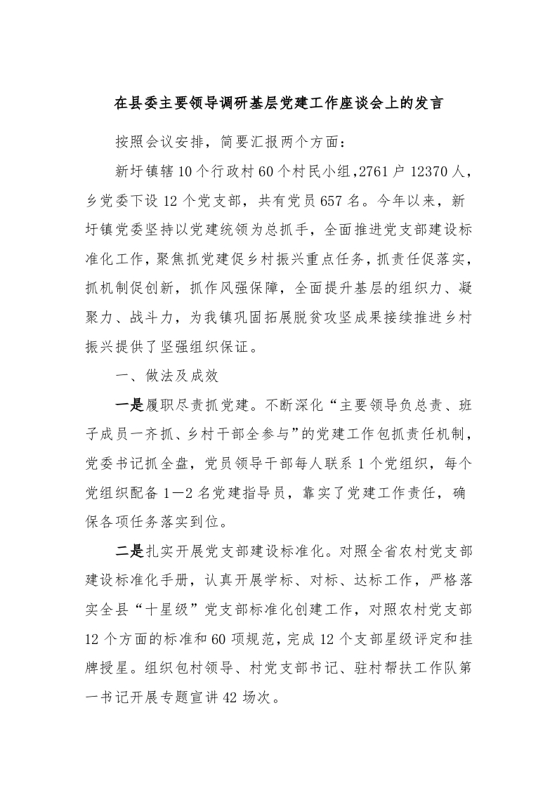 在县委主要领导调研基层党建工作座谈会上的发言