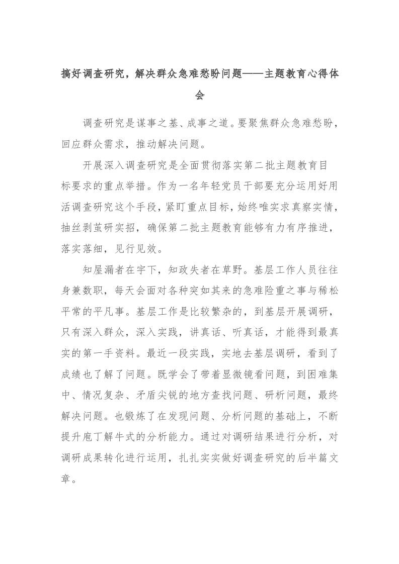 / 搞好调查研究,解决群众急难愁盼问题——主题教育心得体会