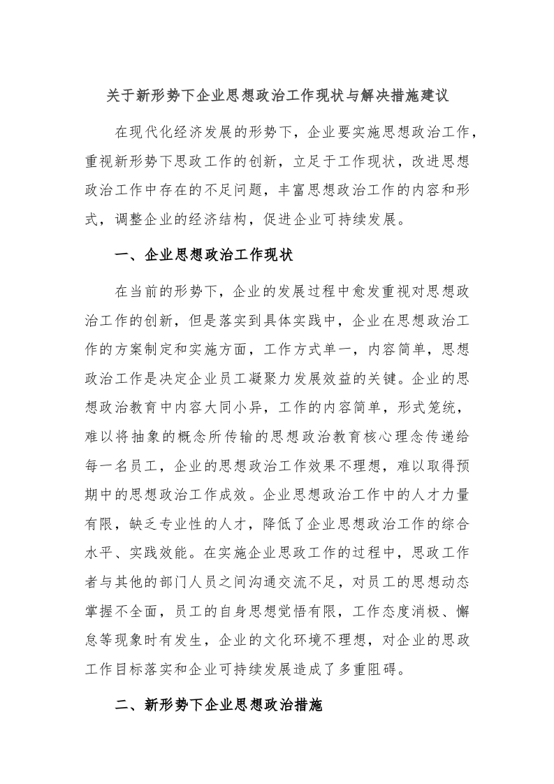 / 关于新形势下企业思想政治工作现状与解决措施建议