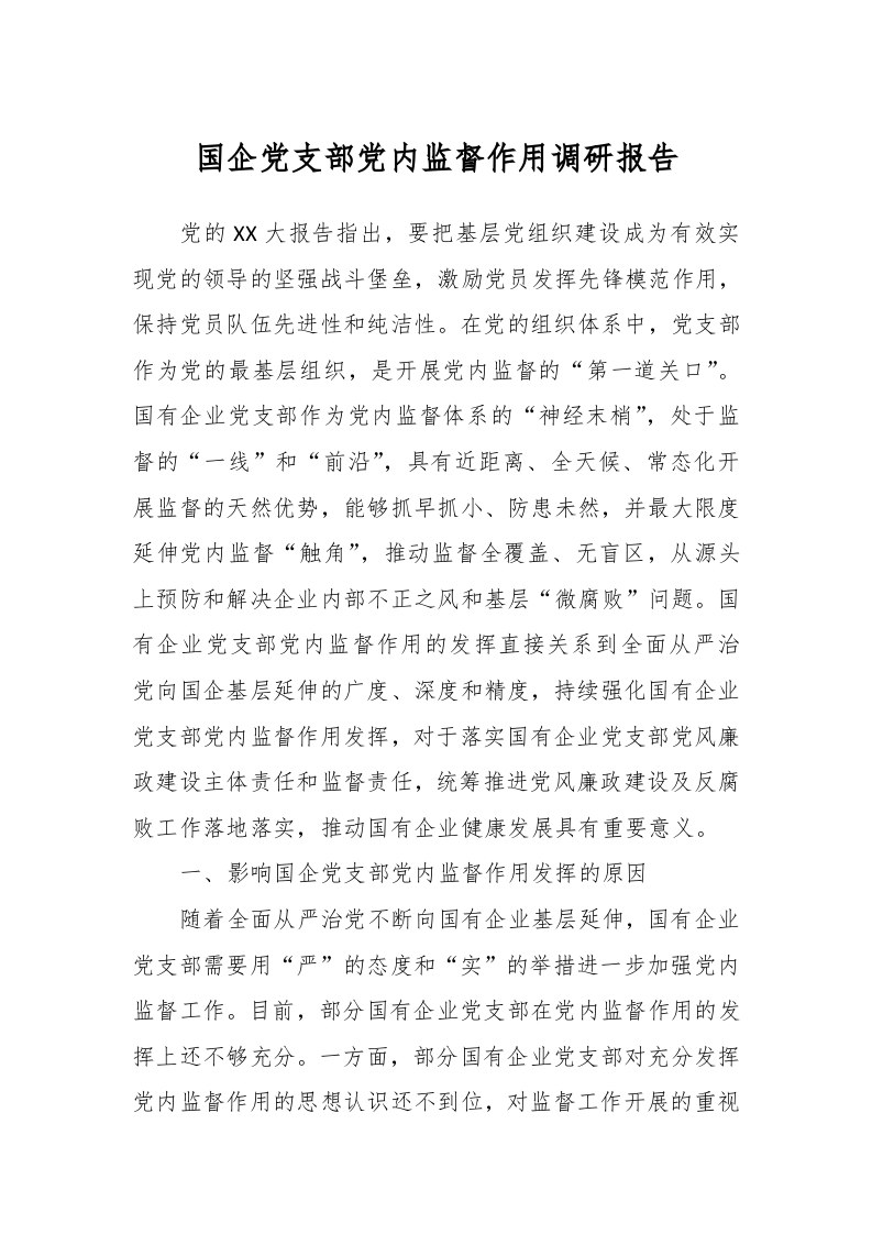 / 国企党支部党内监督作用调研报告