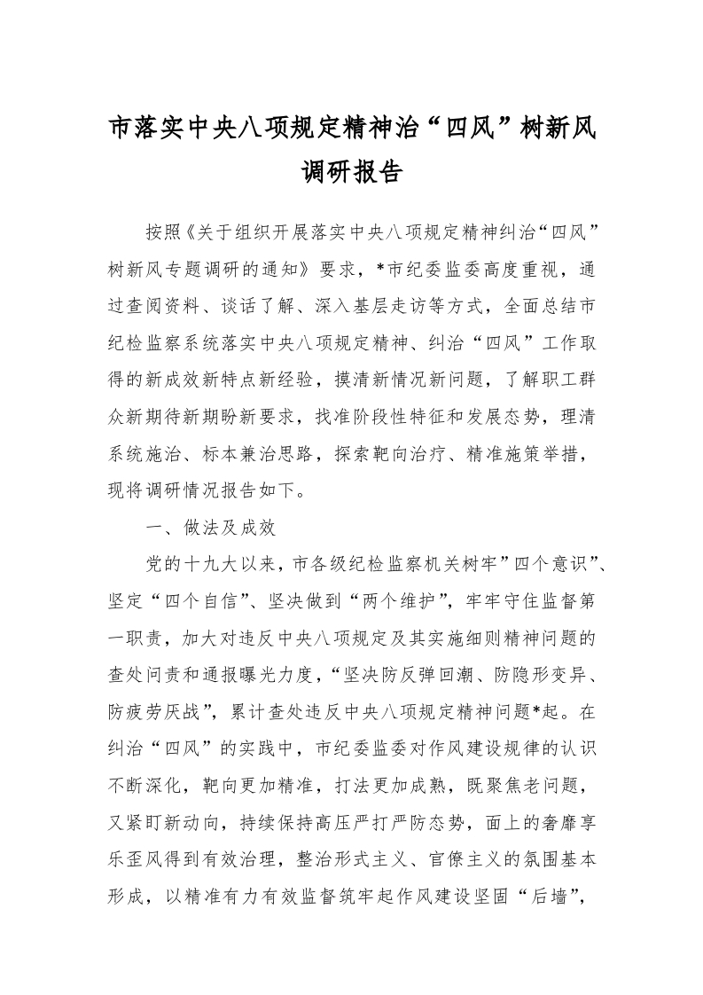 / 市落实中央八项规定精神治“四风”树新风调研报告