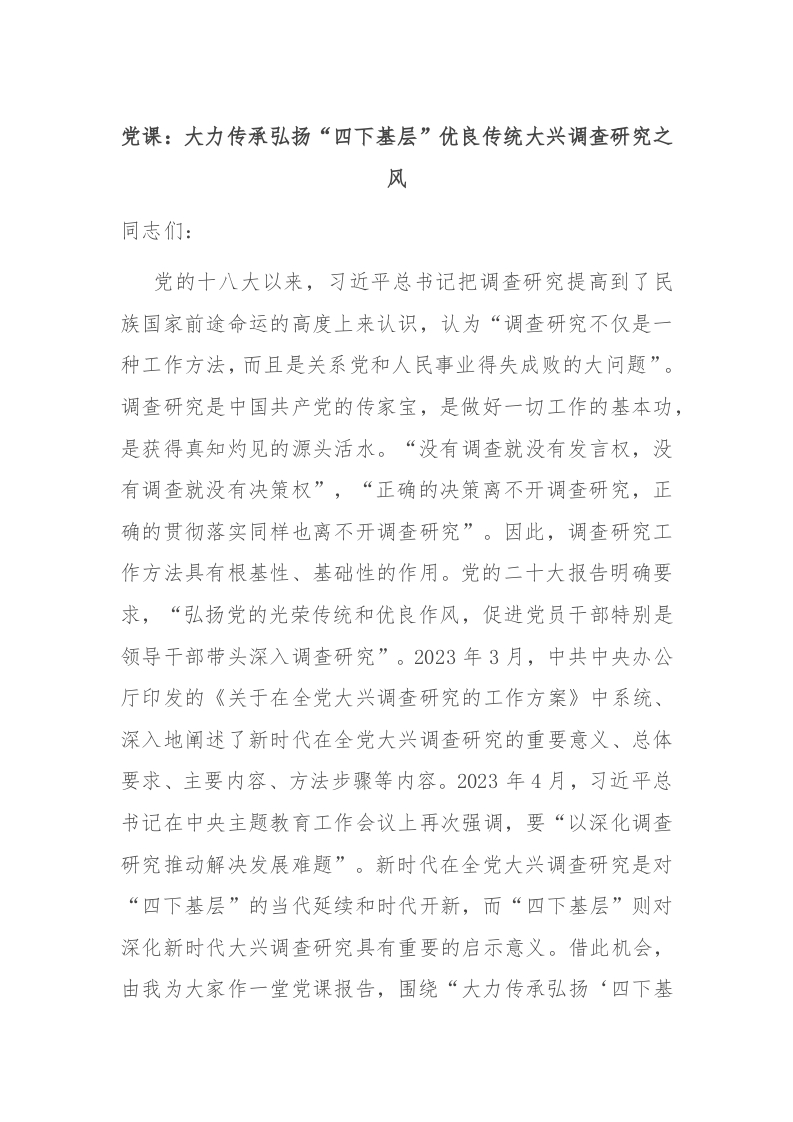 / 党课:大力传承弘扬“四下基层”优良传统 大兴调查研究之风