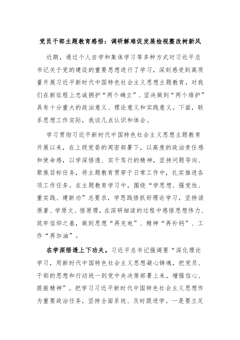 / 党员干部主题教育感悟:调研解难促发展 检视整改树新风