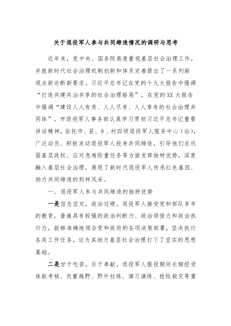 / 关于退役军人参与共同缔造情况的调研与思考