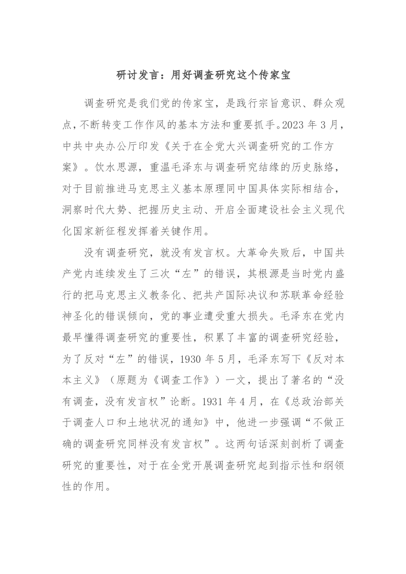 / 研讨发言:用好调查研究这个传家宝