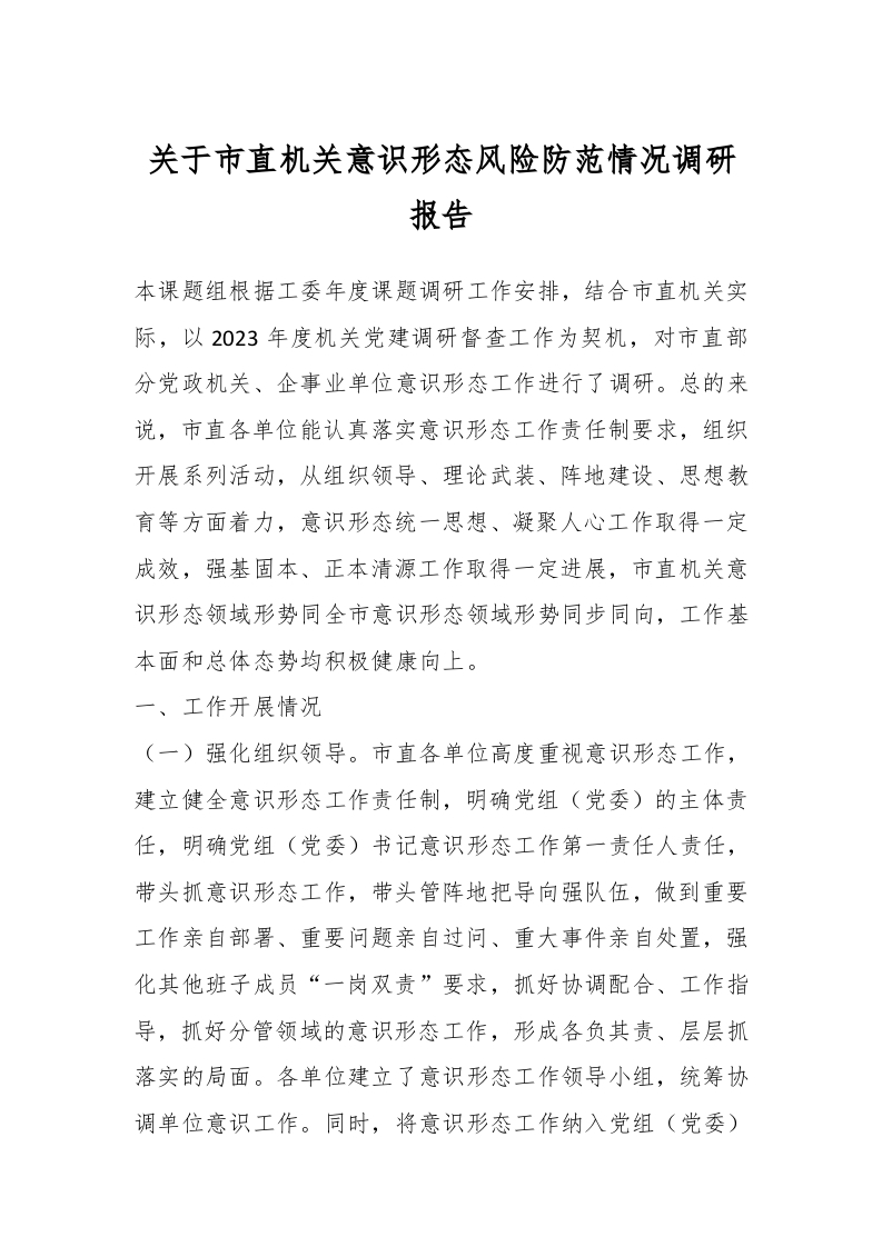 / 关于市直机关意识形态风险防范情况调研报告