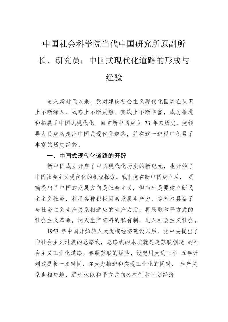 / 中国社会科学院当代中国研究所原副所长、研究员:中国式现代化道路的形成与经验