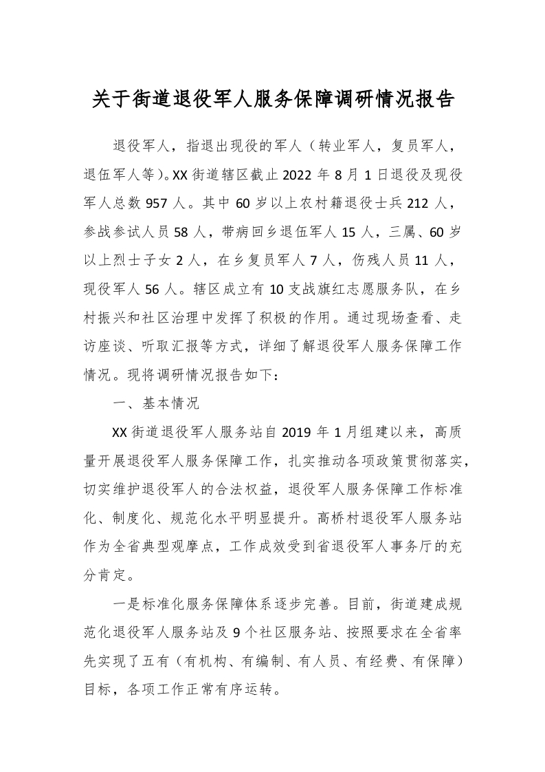 / 关于街道退役军人服务保障调研情况报告