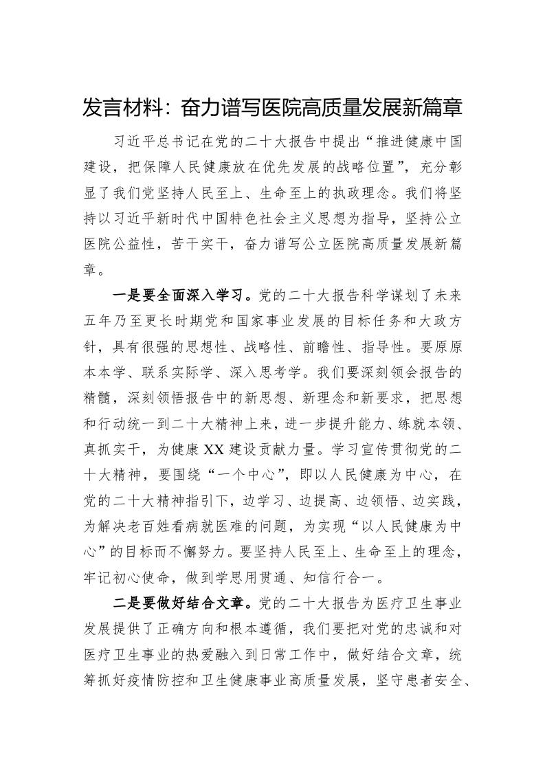 / 发言材料:奋力谱写医院高质量发展新篇章