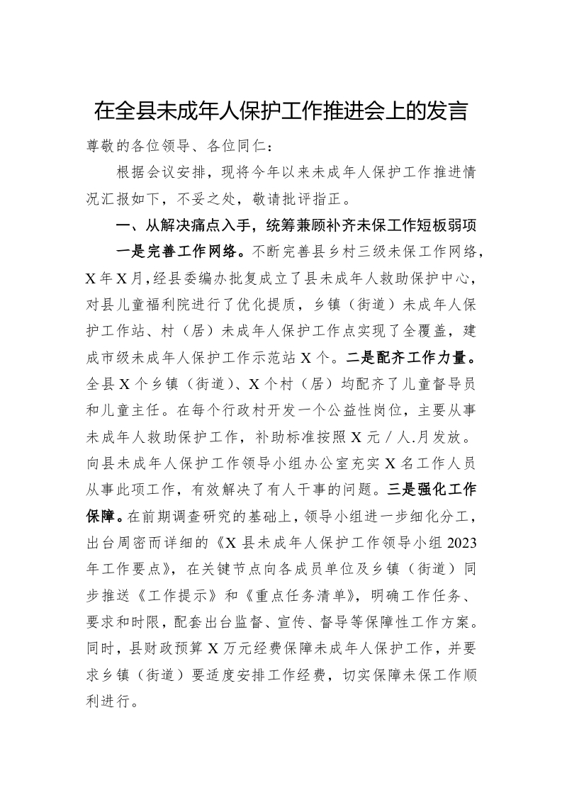 / 在全县未成年人保护工作推进会上的发言