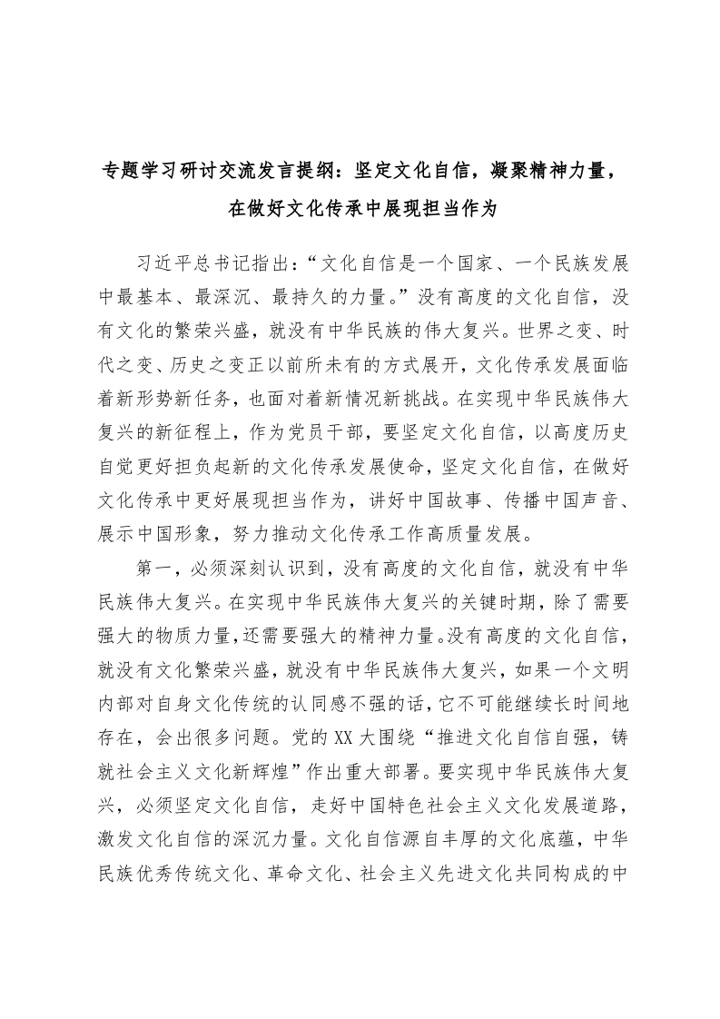 / 专题学习研讨交流发言提纲:坚定文化自信,凝聚精神力量,在做好文化传承中展现担当作为