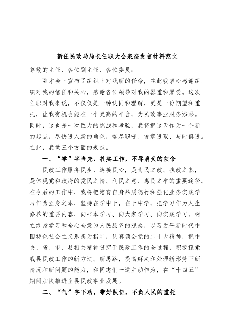 / 新任民政局局长任职大会表态发言材料