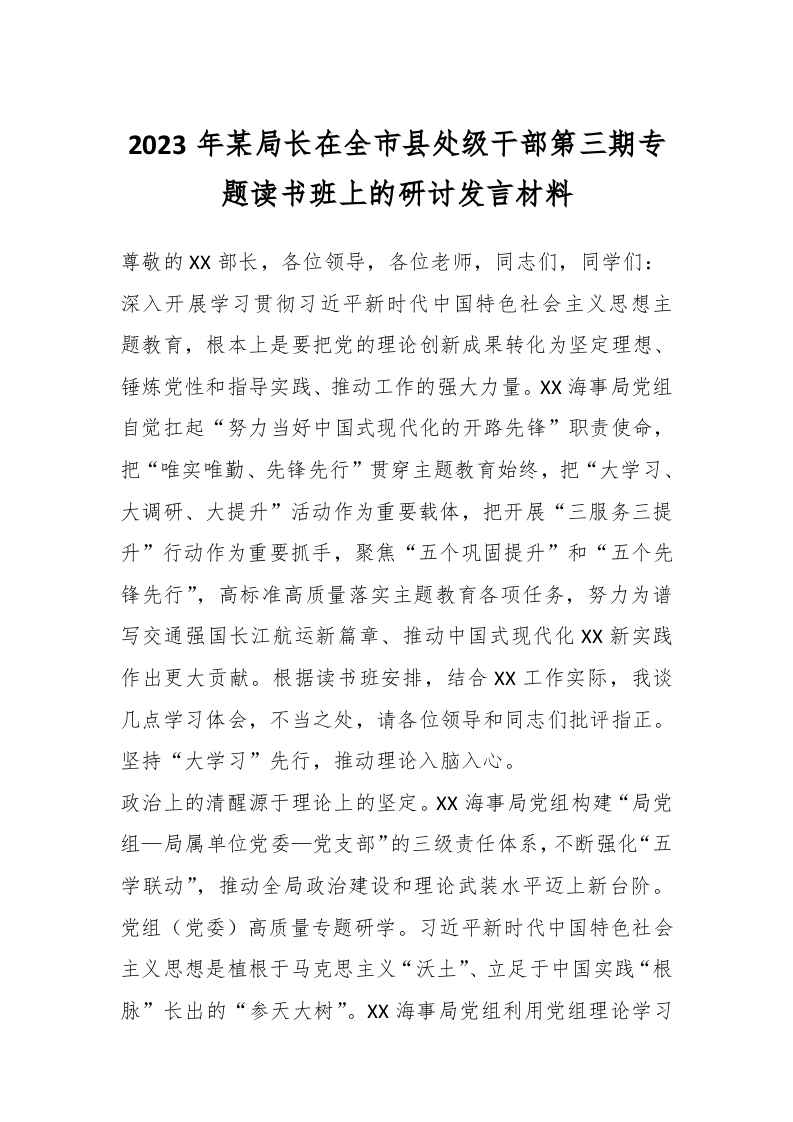2023年某局长在全市县处级干部第三期专题读书班上的研讨发言材料