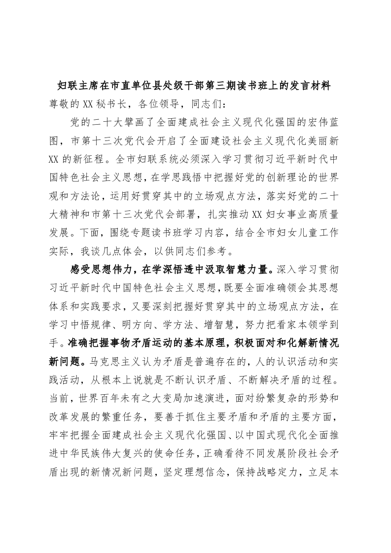 / 妇联主席在市直单位县处级干部第三期读书班上的发言材料