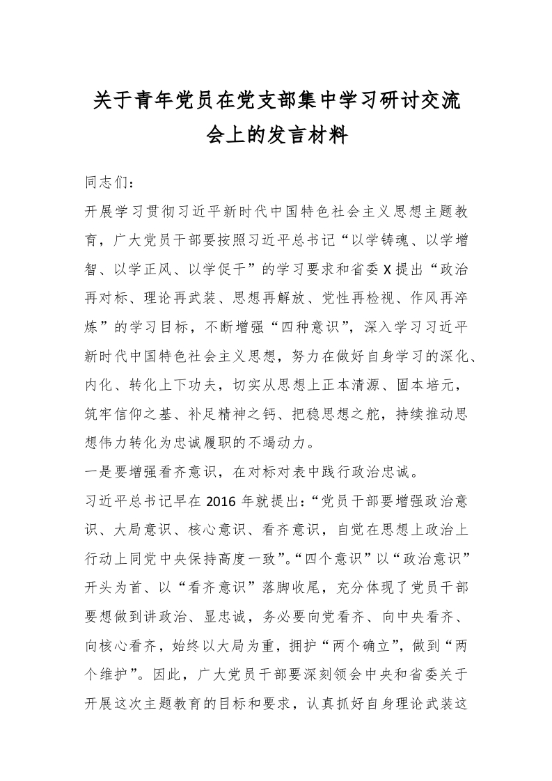 / 关于青年党员在党支部集中学习研讨交流会上的发言材料