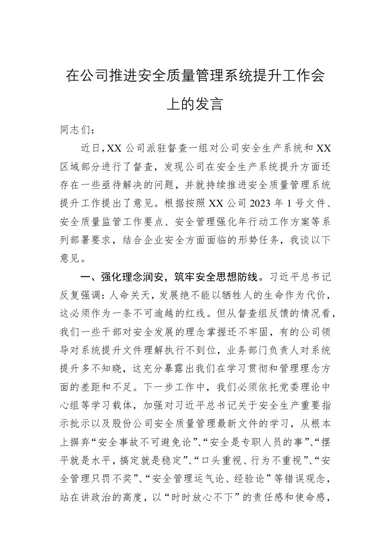 / 在公司推进安全质量管理系统提升工作会上的发言