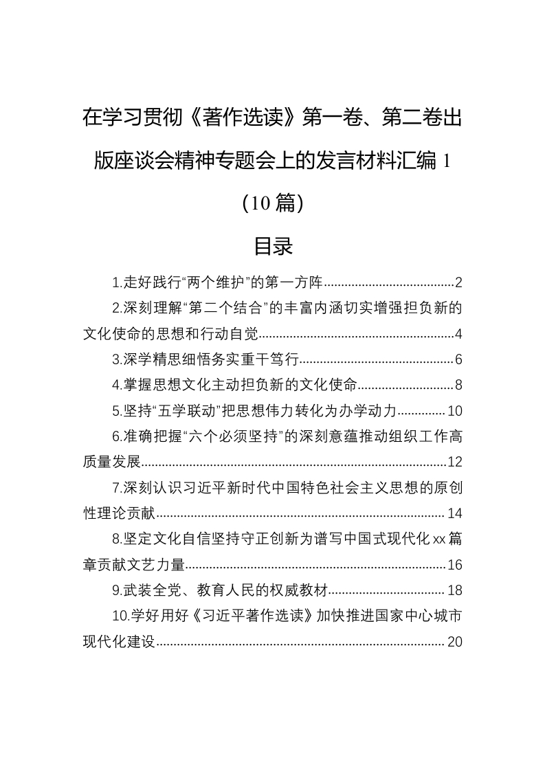 / 在学习贯彻《著作选读》第一卷、第二卷出版座谈会精神专题会上的发言材料汇编(10篇)