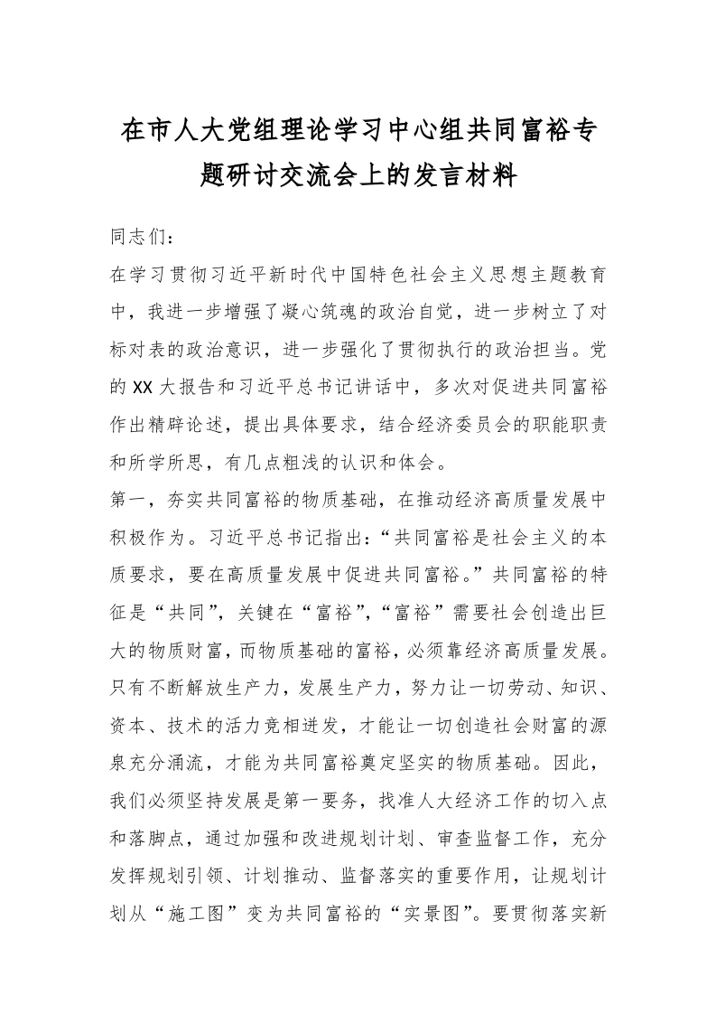 / 在市人大党组理论学习中心组共同富裕专题研讨交流会上的发言材料