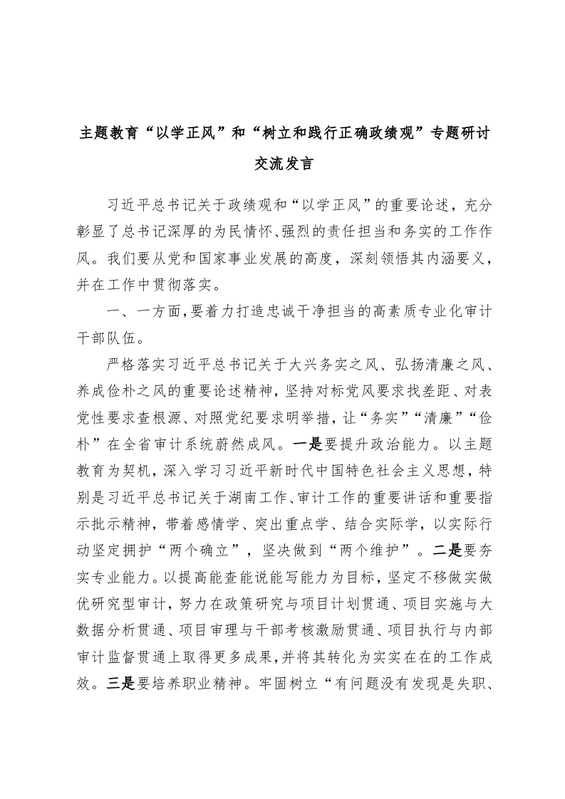 / (2篇)主题教育“以学正风”和“树立和践行正确政绩观”专题研讨交流发言