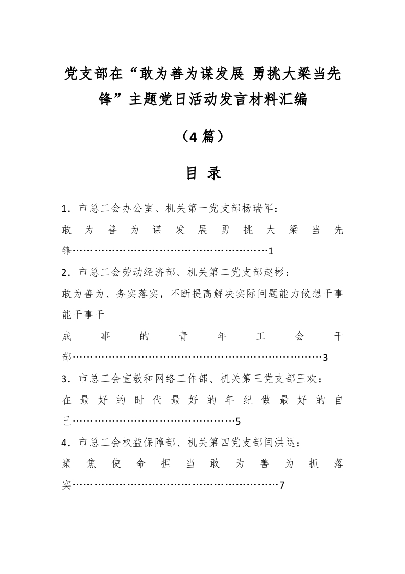 (4篇)党支部在“敢为善为谋发展 勇挑大梁当先锋”主题党日活动发言材料汇编