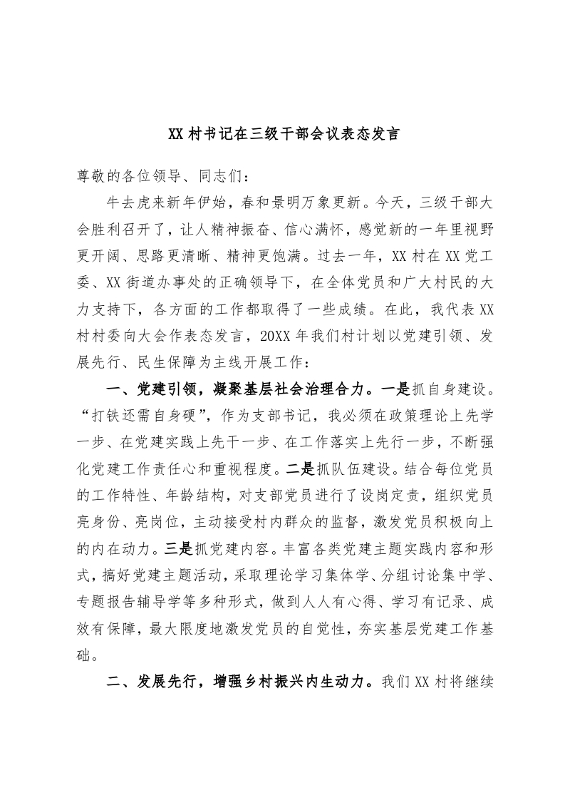 / XX村书记在三级干部会议表态发言