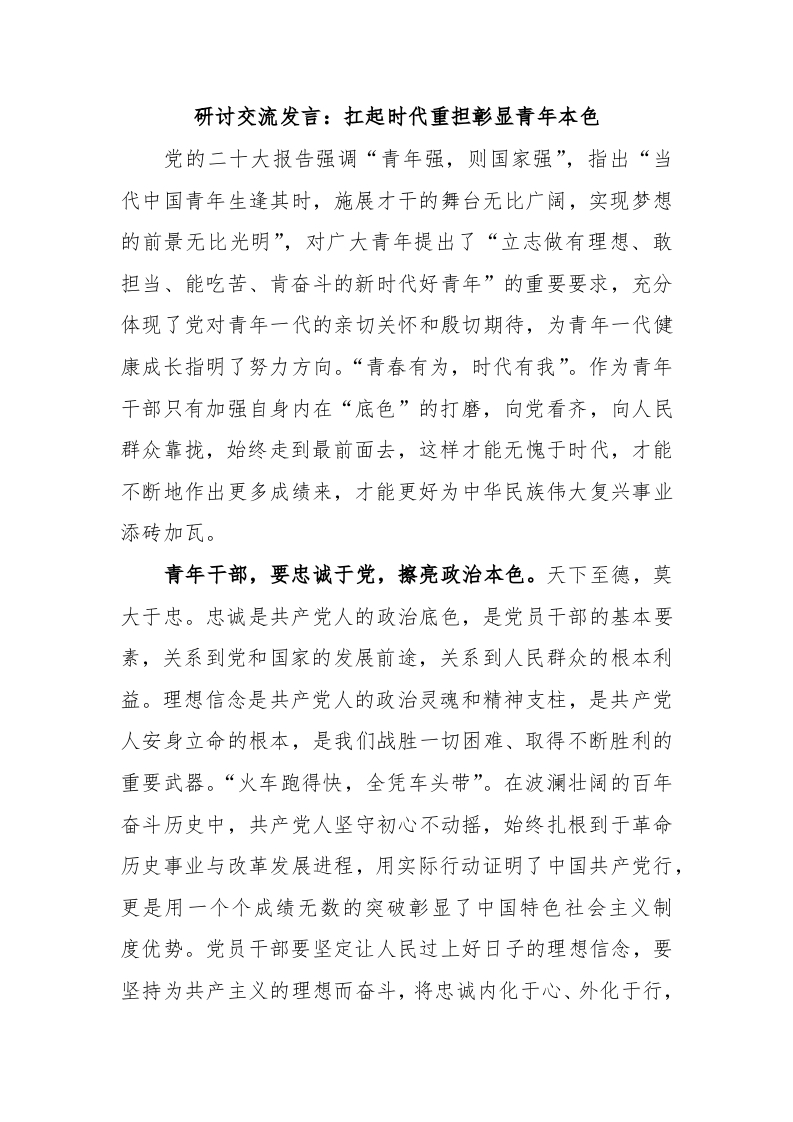研讨交流发言:扛起时代重担彰显青年本色