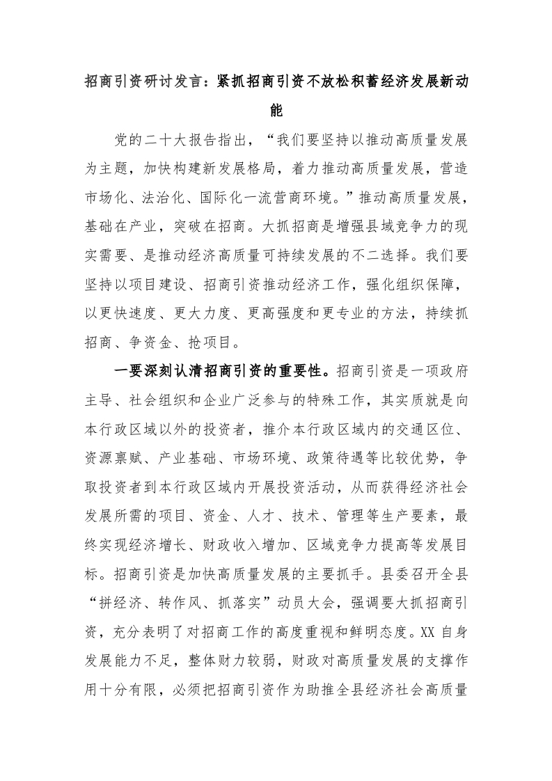 / 招商引资研讨发言:紧抓招商引资不放松积蓄经济发展新动能