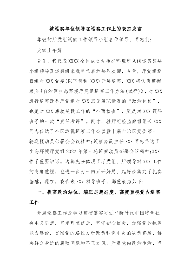 / 被巡察单位领导在巡察工作上的表态发言