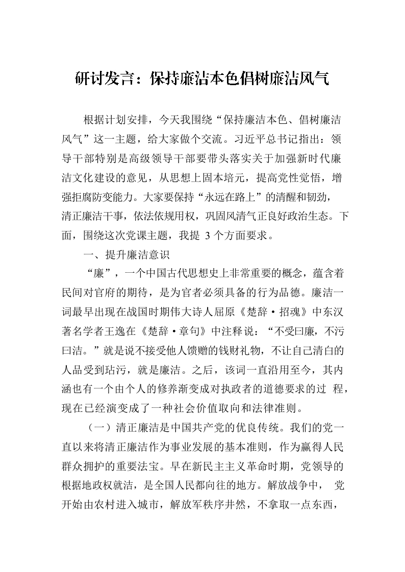 / 研讨发言:保持廉洁本色倡树廉洁风气
