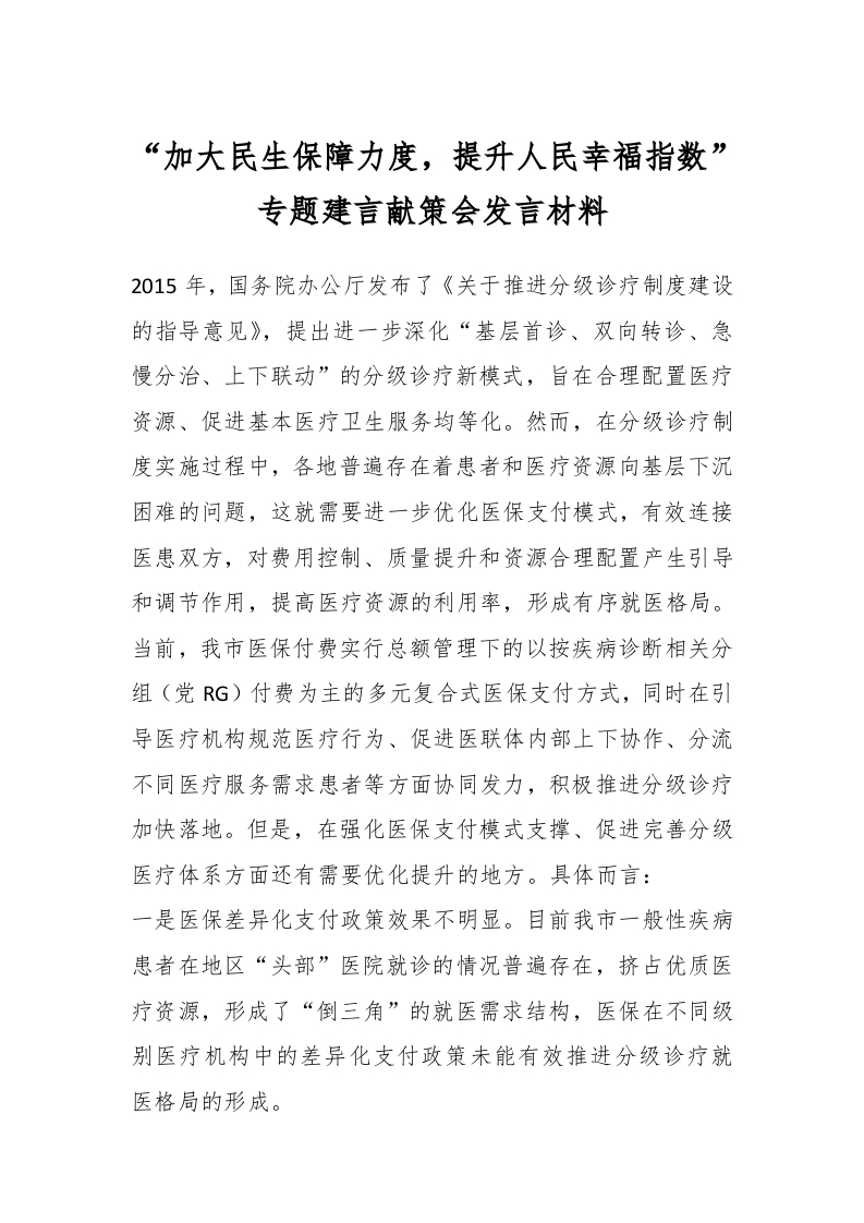 / “加大民生保障力度,提升人民幸福指数”专题建言献策会发言材料