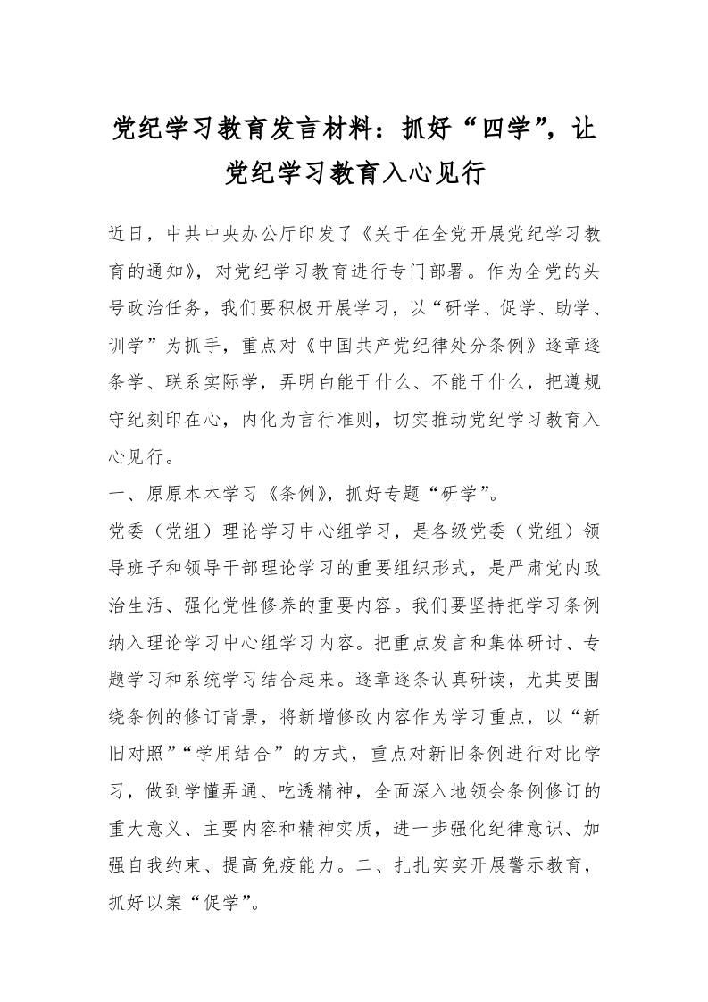 / 党纪学习教育发言材料:抓好“四学”,让党纪学习教育入心见行