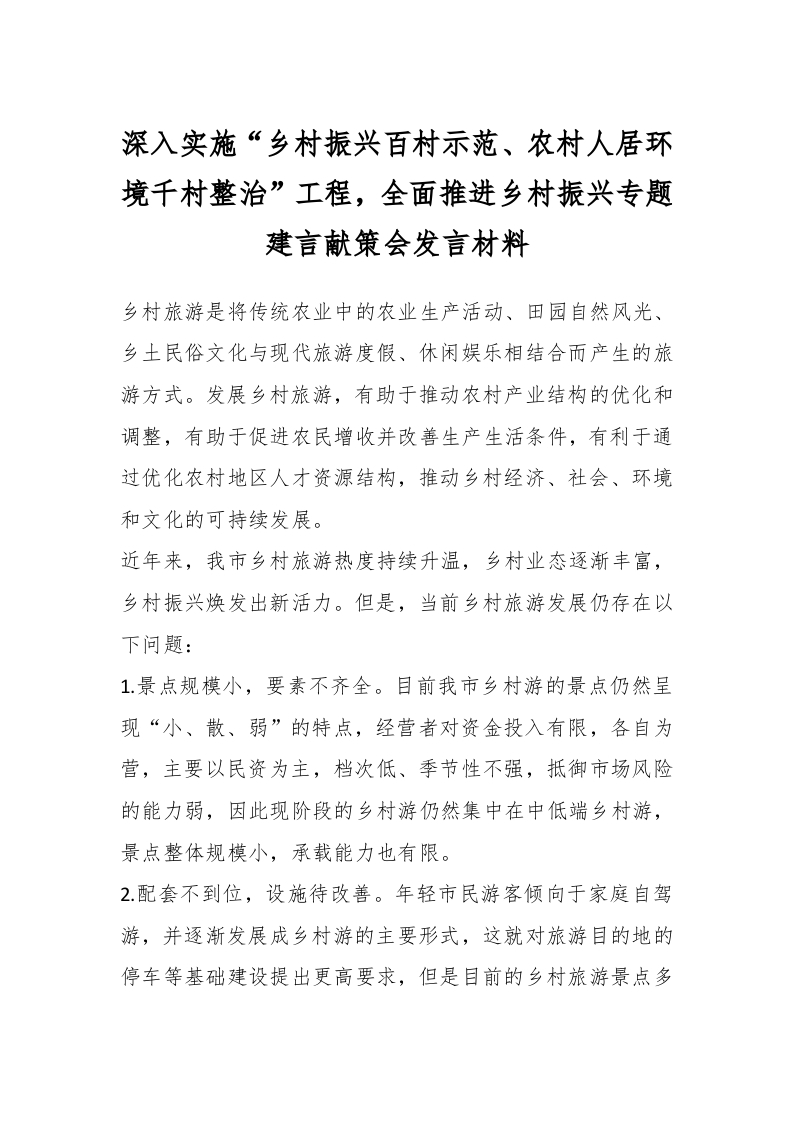 / 深入实施“乡村振兴百村示范、农村人居环境千村整治”工程,全面推进乡村振兴专题建言献策会发言材料