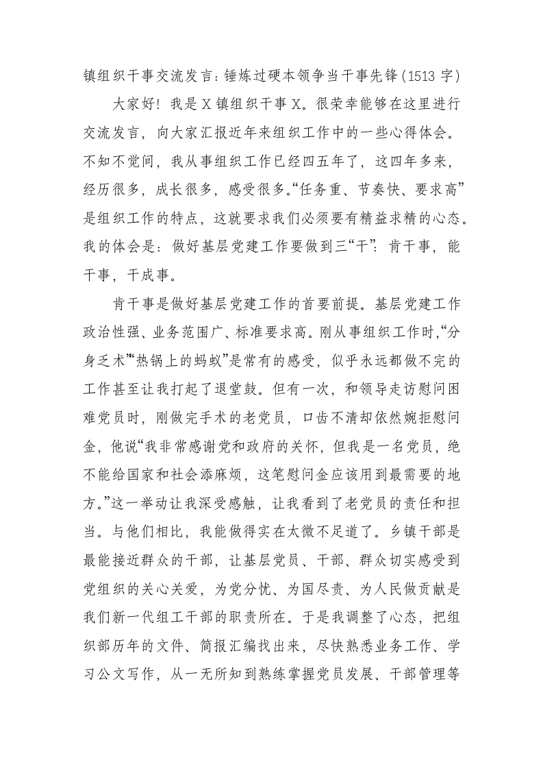 / 镇组织干事交流发言:锤炼过硬本领争当干事先锋(1513字)