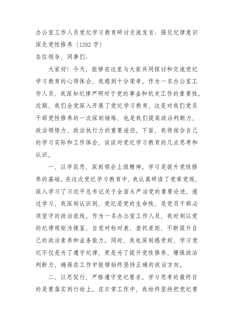 / 办公室工作人员党纪学习教育研讨交流发言:强化纪律意识深化党性修养(1392字)