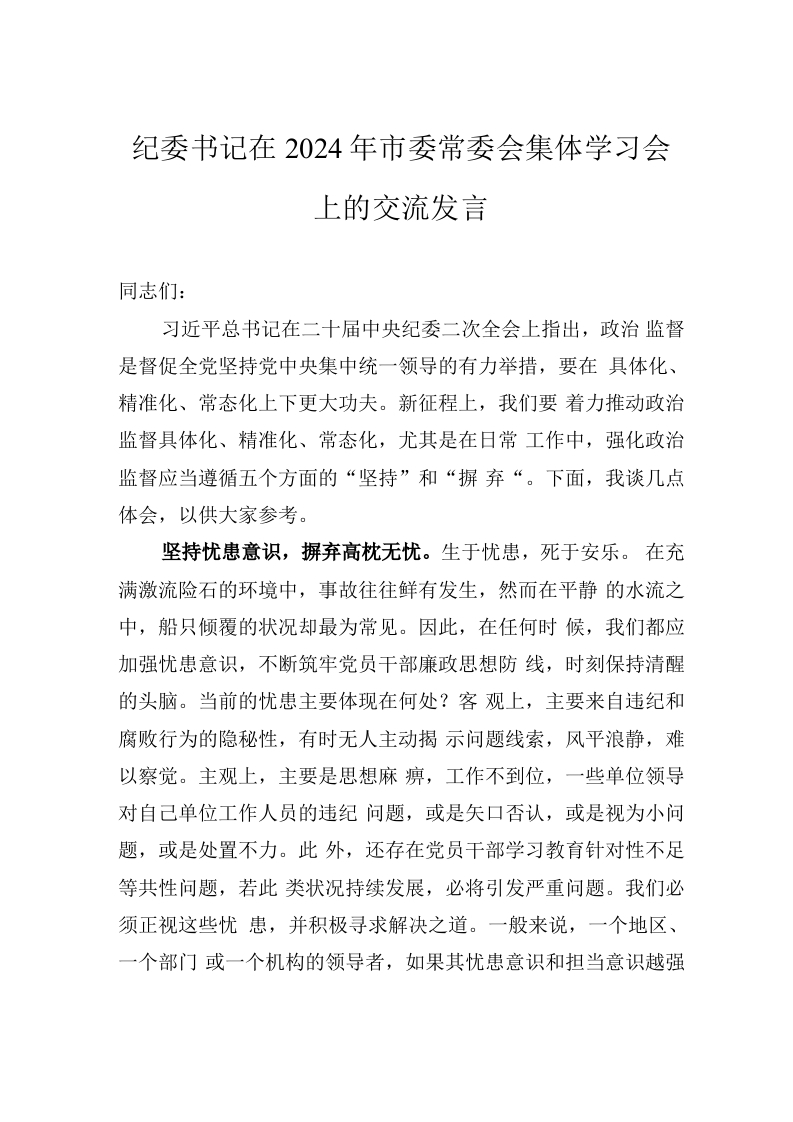 / 纪委书记在2024年市委常委会集体学习会上的交流发言