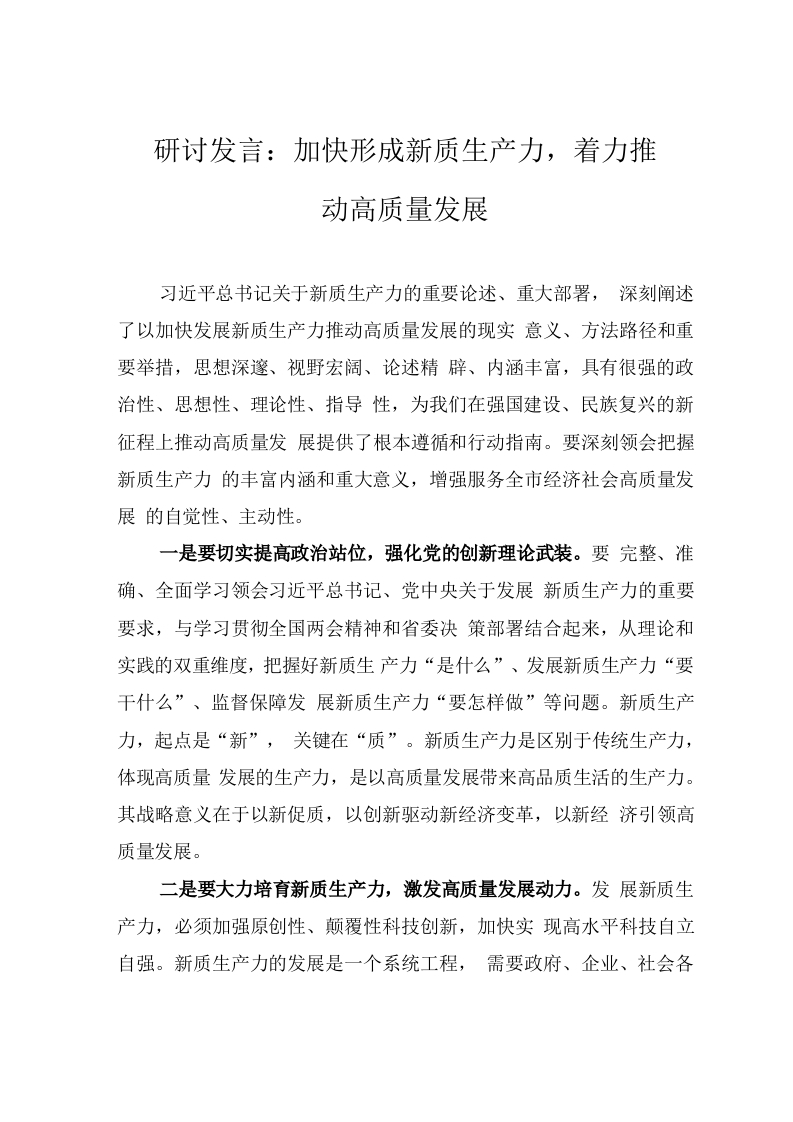 研讨发言:加快形成新质生产力,着力推动高质量发展