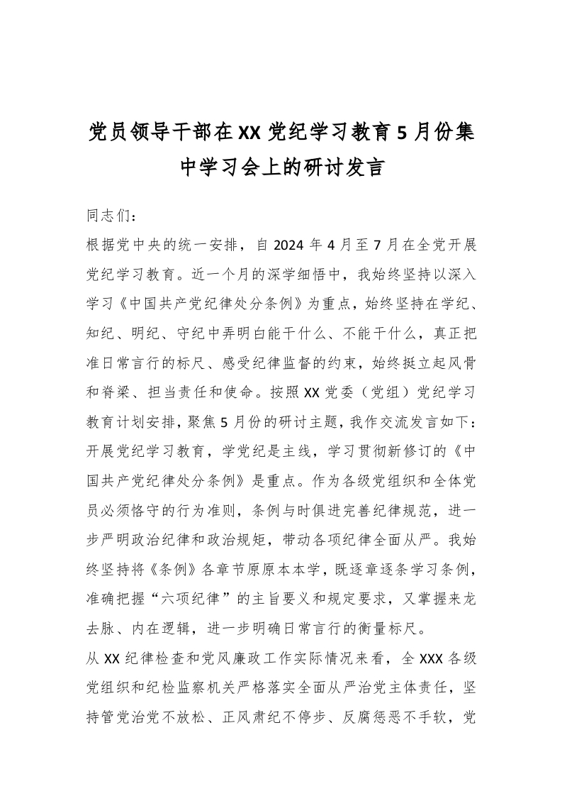 / 党员领导干部在XX党纪学习教育5月份集中学习会上的研讨发言