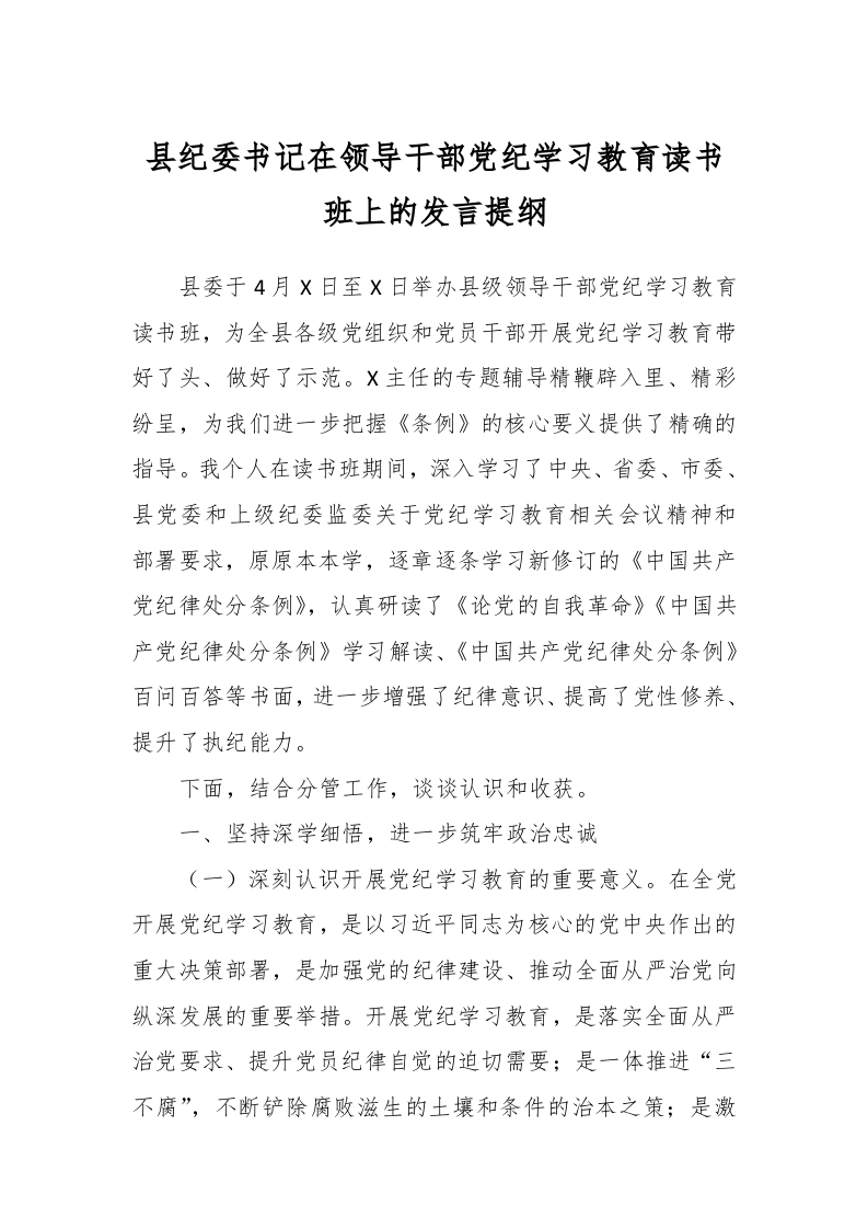 / 县纪委书记在领导干部党纪学习教育读书班上的发言提纲