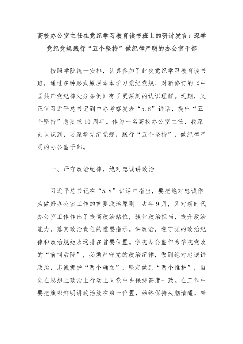 / 高校办公室主任在党纪学习教育读书班上的研讨发言:深学党纪党规践行“五个坚持”做纪律严明的办公室干部