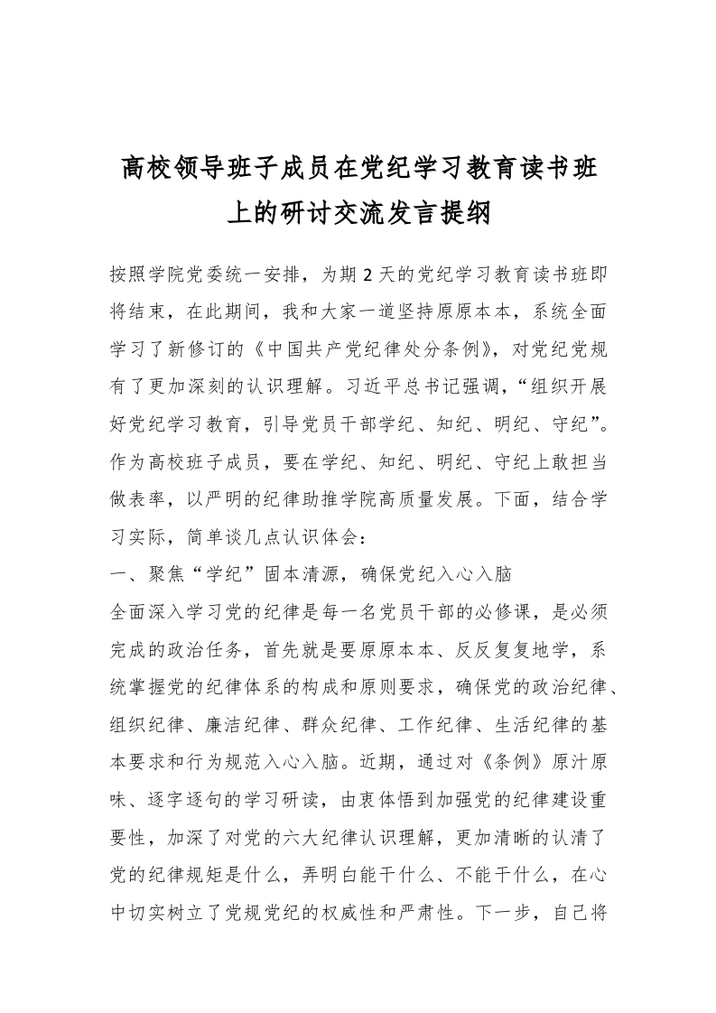 / 高校领导班子成员在党纪学习教育读书班上的研讨交流发言提纲