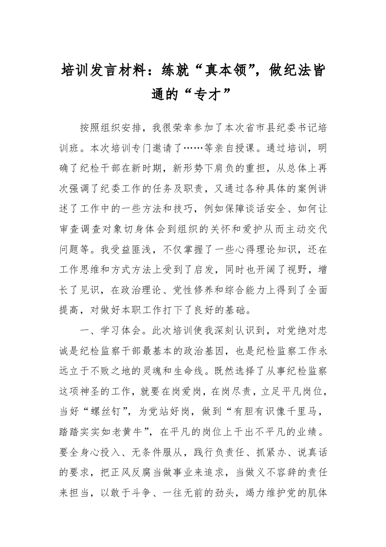 / 培训发言材料:练就“真本领”,做纪法皆通的“专才”