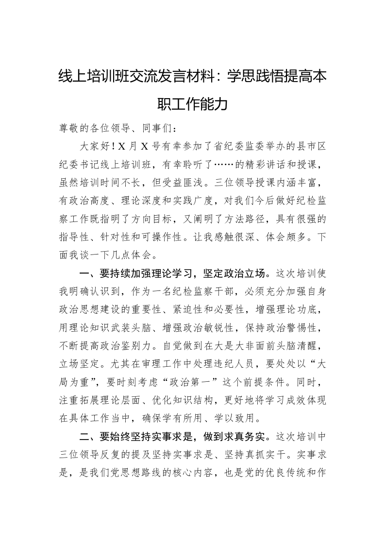 / 线上培训班交流发言材料:学思践悟提高本职工作能力