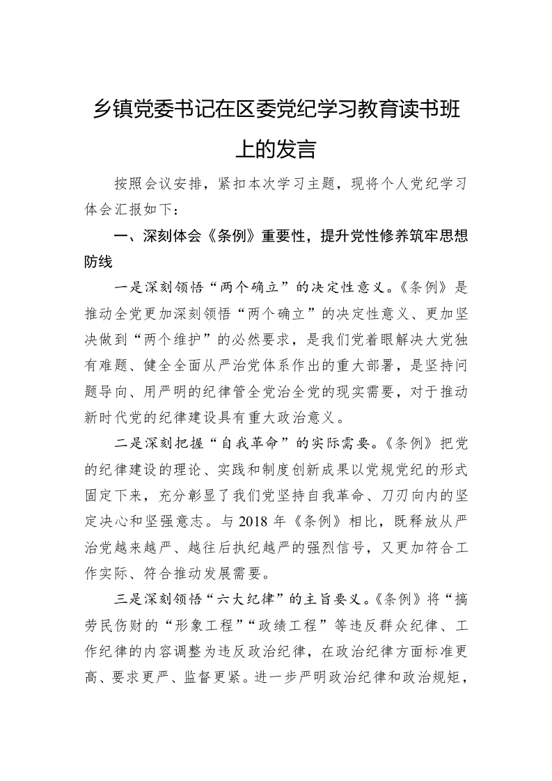/ 乡镇党委书记在区委党纪学习教育读书班上的发言