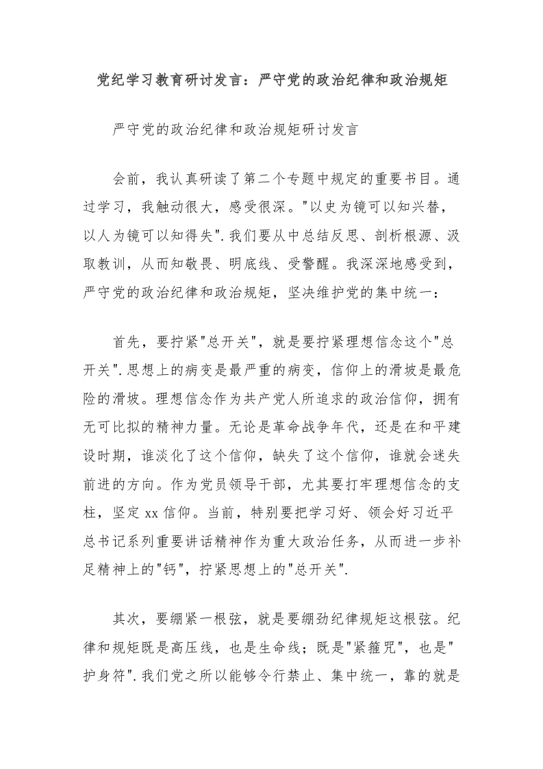 / 党纪学习教育研讨发言:严守党的政治纪律和政治规矩